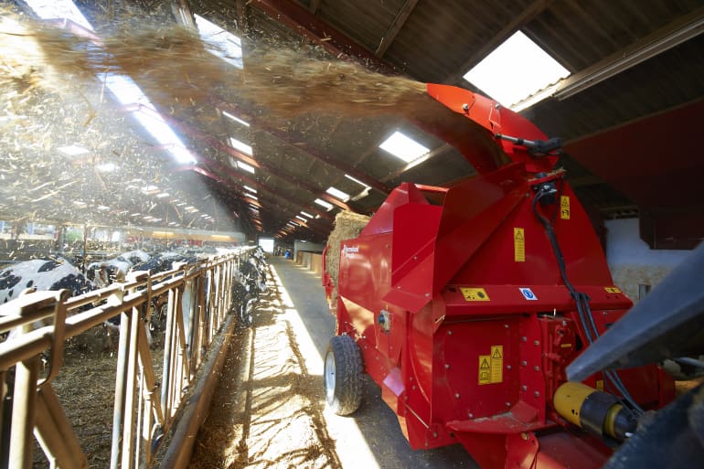 - Kombinacja nowego koła zamachowego oraz dzielonego 3-stopniowo wysypu gwarantuje możliwość ścielenia w najbardziej odległych miejscach.